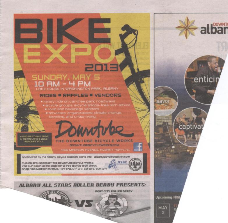 For a second year running, the Downtube Bicycle Works has sponsored a nice big Bicycle EXPO ad in the 5/2/13 Metroland. In addition to ad sponsorship, the Downtube will celebrate its third year at the EXPO with a booth featuring its products and maintenance services.
