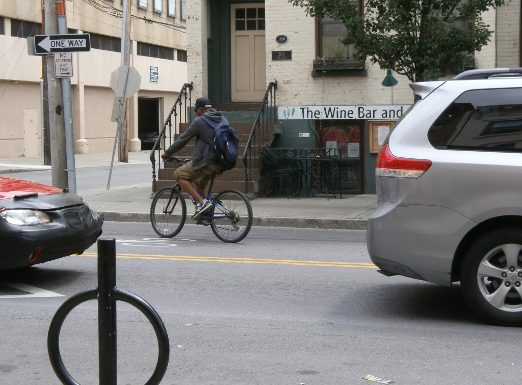 Basic city transposition on Lark St. – mountain bike and back pack.